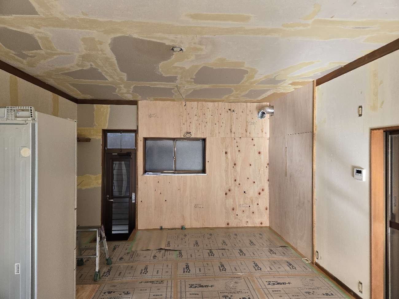 天井・壁・床のすべての内装材(クロス)を撤去し、下地がむき出しになった状態↓